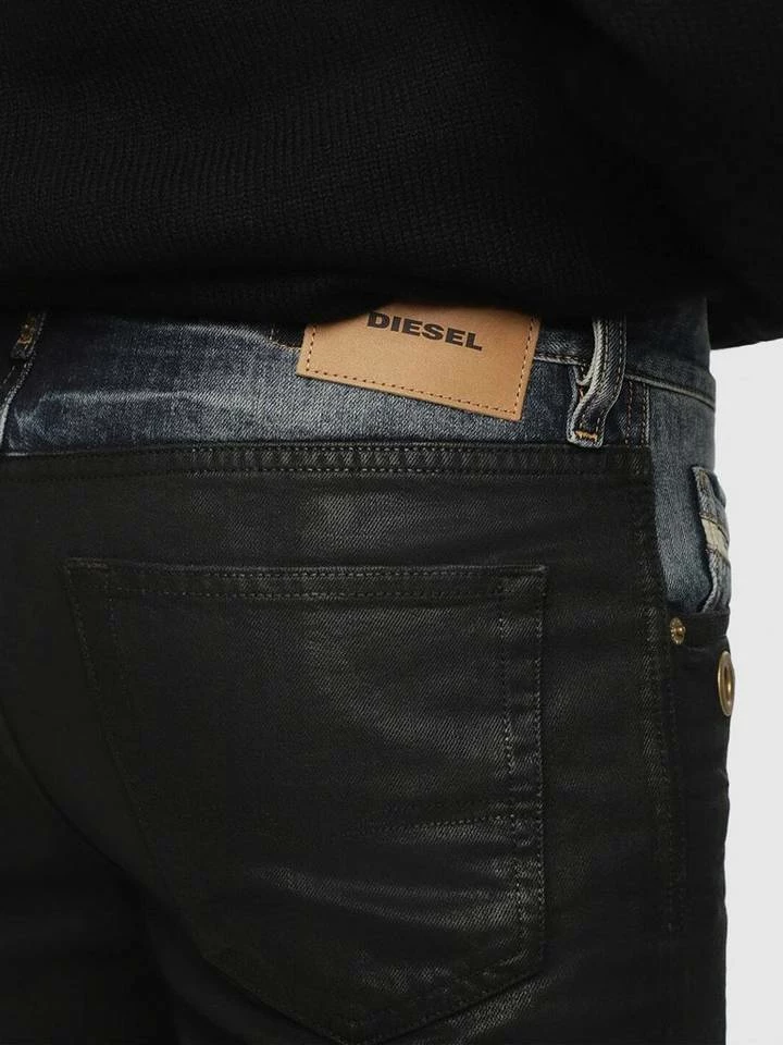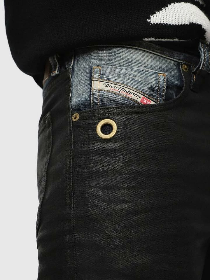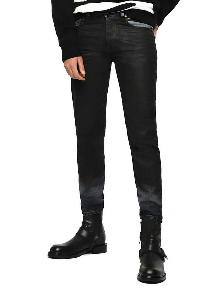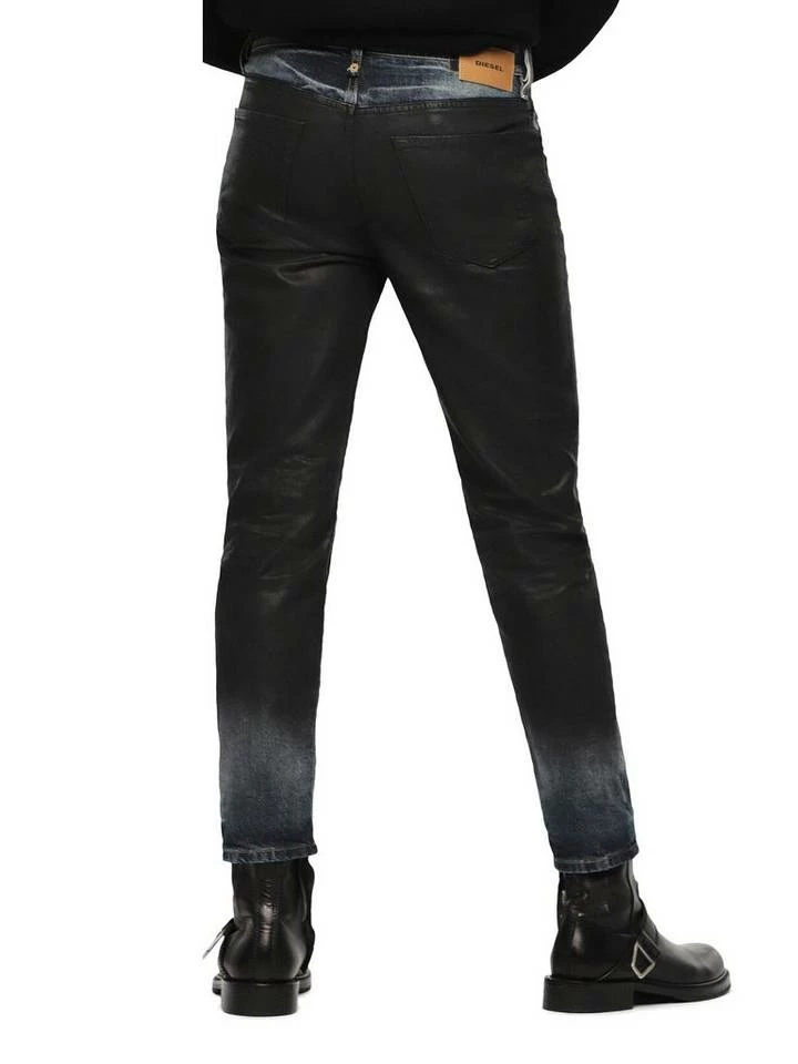 Eine schmal geschnittene Jeans mit eher tieferem Schritt. Die Silhouette in klassischer Five-Pocket-Konstruktion wird durch eine leichte Cropped-Beinpartie abgerundet. Ein ausgeklügelter Behandlungsmix verleiht diesem Denim ein edles Finish. Das feste dunkelblaue Gewebe wird großflächig und Rissdetails versehen. Die Beschichtung sorgt für einen lederartigen Look.