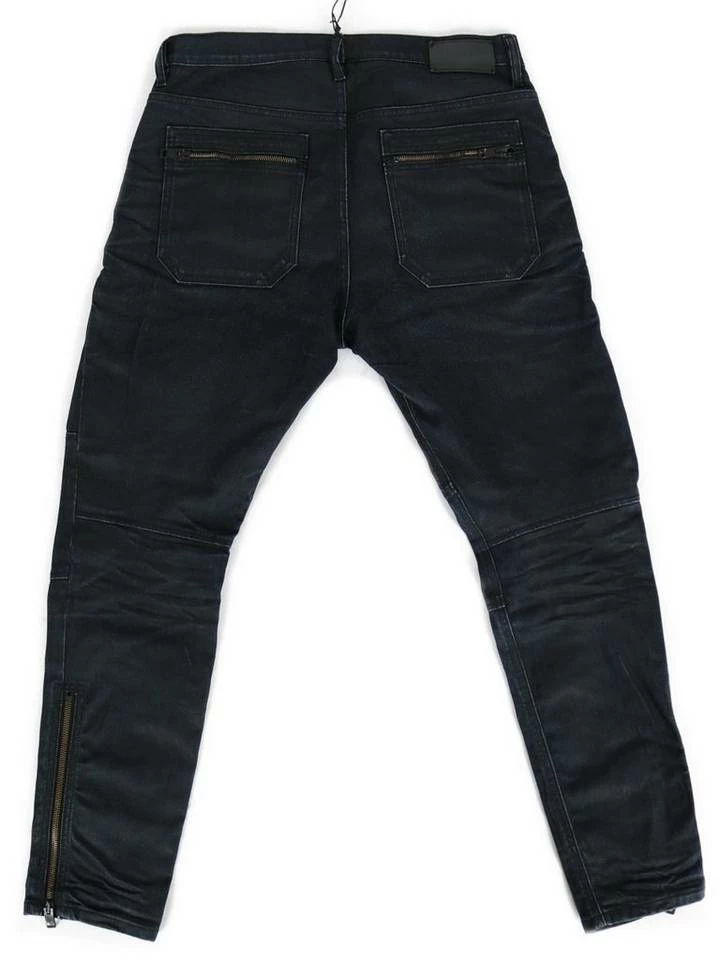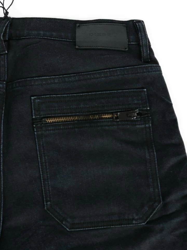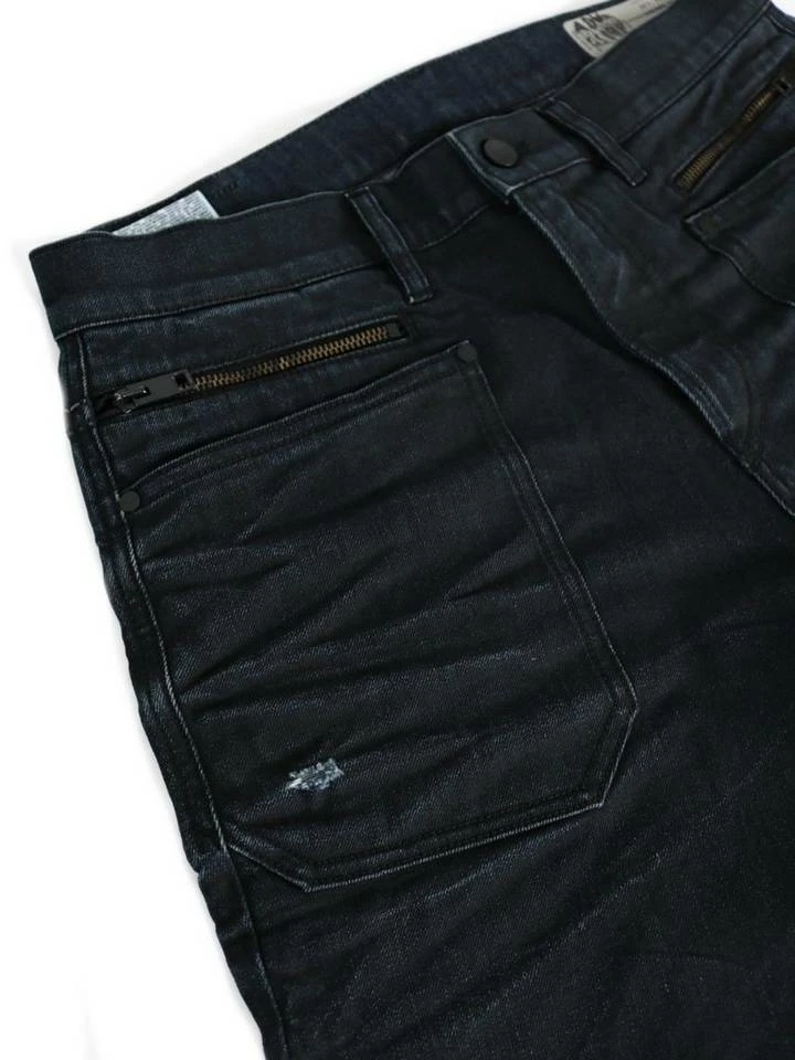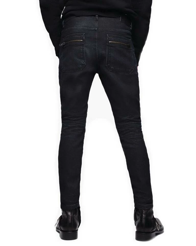 Eine körperbetonte Jeans. Das Modell ist für einen markanten Biker-Look mit ergonomischen Details und praktischen Reißverschlüssen an den Beinabschlüssen gearbeitet. Die Jeans aus klarem dunkelblauem Stretchdenim kombiniert handgearbeitete Faltendetails mit großflächigen Used-Effekten, Riss- und Flickdetails sowie einem 3D-Finish.