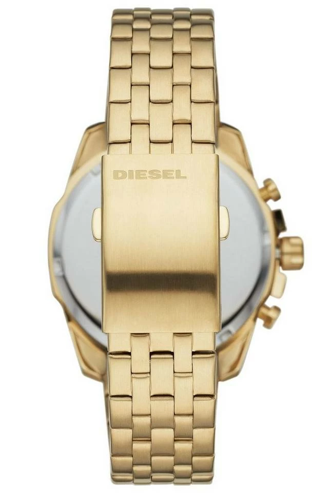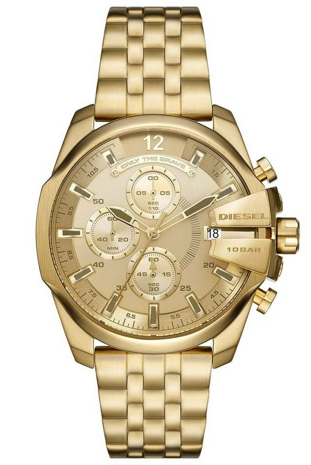 edle Armbanduhr für Männer, präzises Chrono-Quarzwerk, Datumsanzeige, Stoppfunktion in Sekundenschritten bis zu 30 Minuten, 24-Stunden-Anzeige, goldfarbenes Sunray-Zifferblatt, hellgrau akzentuierte Zeiger und Indizes, zentraler Sekundenzeiger, poliertes, gold ionen-plattiertes Edelstahl-Gehäuse, matte Bandansätze, geriffelte Krone mit aufgesetztem Flankenschutz und Logo, kratzunempfindliches Mineralglas, Armband aus mattiertem, gold ionen-plattiertem Edelstahl, Sicherheitsfaltschließe mit Logo, wasserdicht bis 10 bar, Breite (ohne Krone) 45 mm, Höhe 13 mm