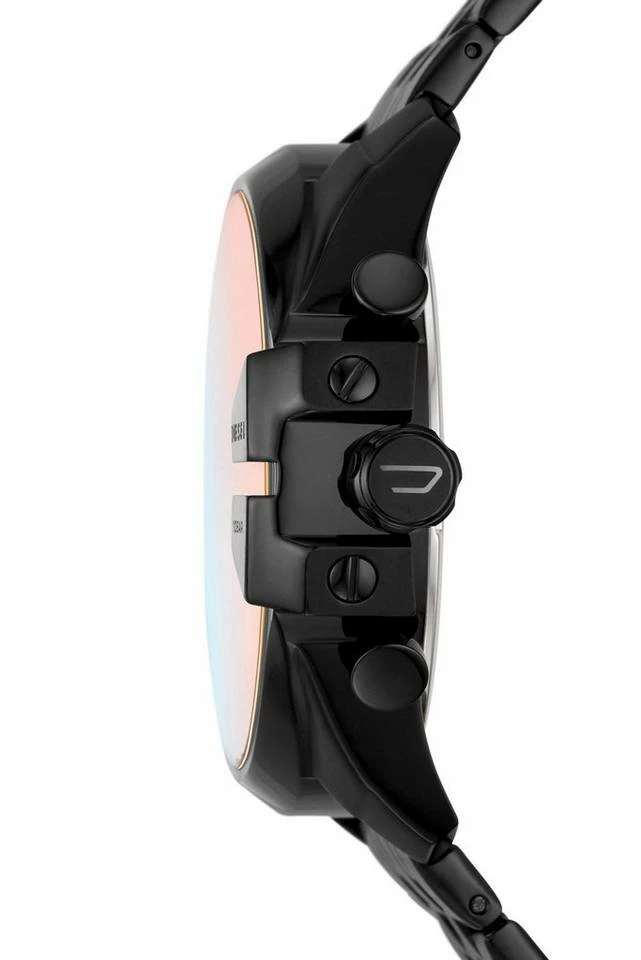 coole Armbanduhr für Männer, präzises Chrono-Quarzwerk, Datumsanzeige, Stoppfunktion in Sekundenschritten bis zu 30 Minuten, 24-Stunden-Anzeige, schwarzes Zifferblatt, weiß akzentuierte Zeiger und Indizes, zentraler Sekundenzeiger, poliertes, schwarz ionen-plattiertes Edelstahl-Gehäuse, matte Bandansätze, geriffelte Krone mit aufgesetztem Flankenschutz und Logo, getöntes Mineralglas, Armband aus mattiertem, schwarz ionen-plattiertem Edelstahl, Sicherheitsfaltschließe mit Logo, wasserdicht bis 10 bar, Breite (ohne Krone) 45 mm, Höhe 13 mm