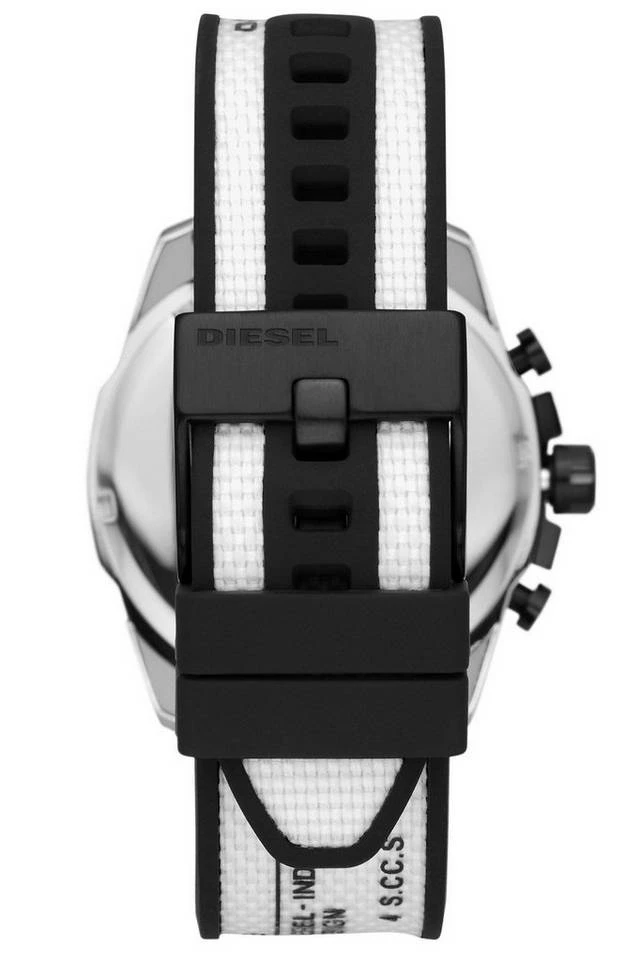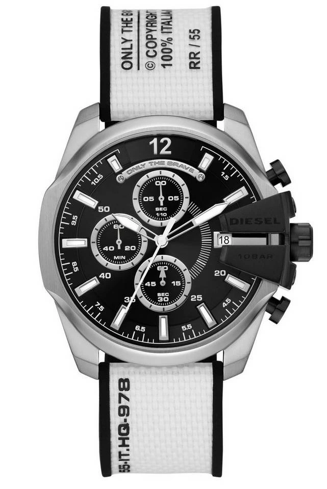 coole Armbanduhr für Männer, präzises Chrono-Quarzwerk, Datumsanzeige, Stoppfunktion in Sekundenschritten bis zu 30 Minuten, 24-Stunden-Anzeige, schwarzes Zifferblatt, polierte Zeiger und Indizes mit Leuchtmasse, zentraler weißer Sekundenzeiger, poliertes/mattiertes Edelstahl-Gehäuse, verschraubter Gehäuseboden, matte Bandansätze, geriffelte Krone mit aufgesetztem Flankenschutz und Logo, kratzunempfindliches Mineralglas, Armband aus schwarzem Silikon und weißem Textil, Dornschließe mit Logo, wasserdicht bis 10 bar, Breite (ohne Krone) 43 mm, Höhe 11,5 mm
