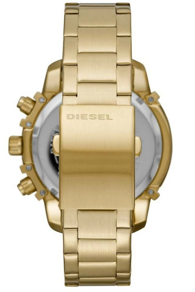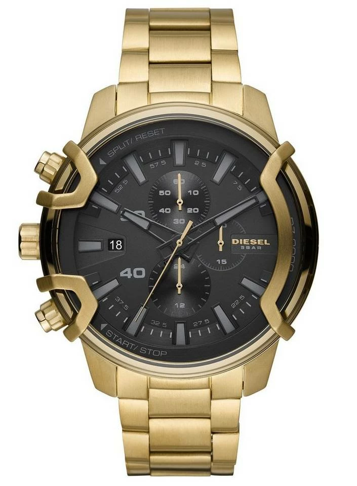 modische Armbanduhr für Männer, poliertes, gold ionenplattiertes Edelstahl-Gehäuse, seitliche Logogravur, matte Bandansätze und Gehäusebügel, linkssitzende geriffelte Krone, geschliffenes Mineralglas, Armband aus mattiertem, gold ionenplattiertem Edelstahl, Sicherheitsfaltschließe, präzises Chrono-Quarzwerk, Datumsanzeige, Stoppfunktion in Sekundenschritten bis zu 30 Minuten, 24-Stunden-Anzeige, schwarzes Zifferblatt, grau akzentuierte Zeiger und Indizes, goldfarbene Zeiger, zentraler Sekundenzeiger, wasserdicht bis 5 bar, Durchmesser 49 mm, Höhe 12,8 mm
