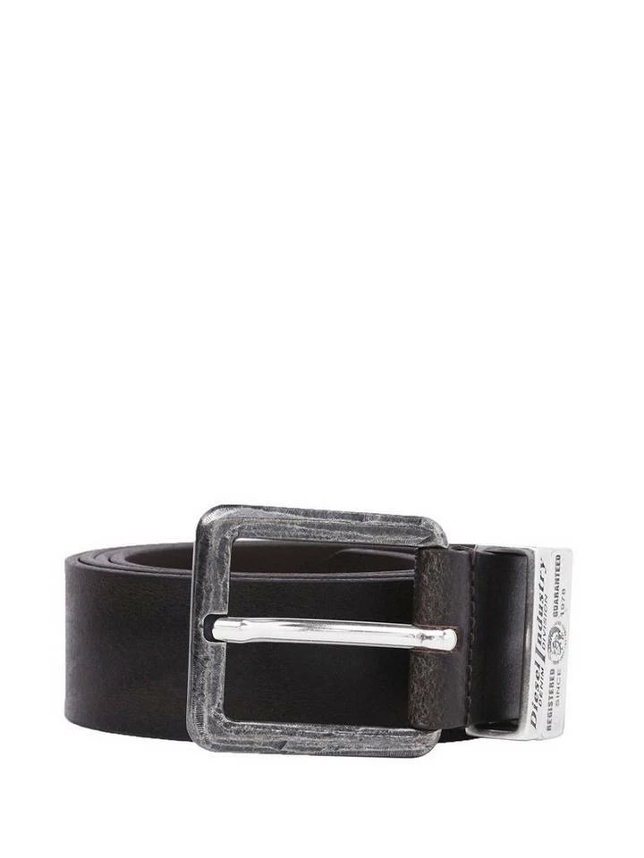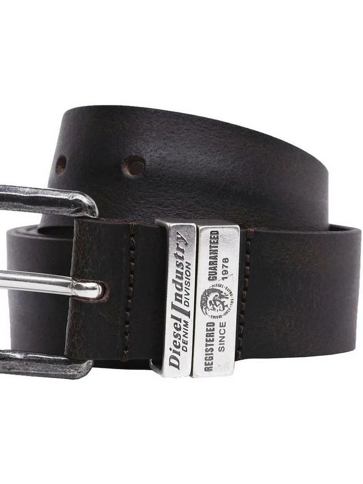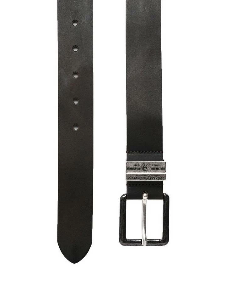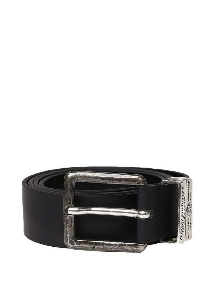 Gürtel aus mattem Glattleder, Metall-Gürtelschlaufen mit geprägtem Logo-Schriftzug, metallene Vintage-Dornschließe, Breite ca. 3,5 cm.