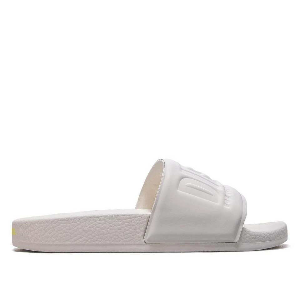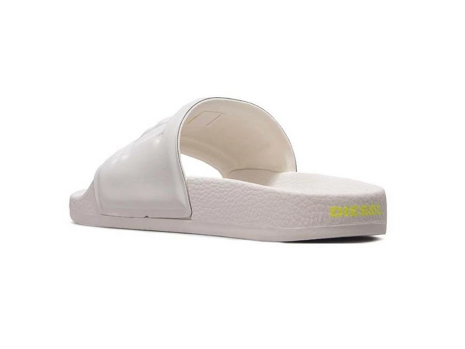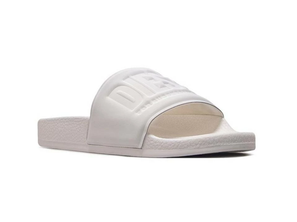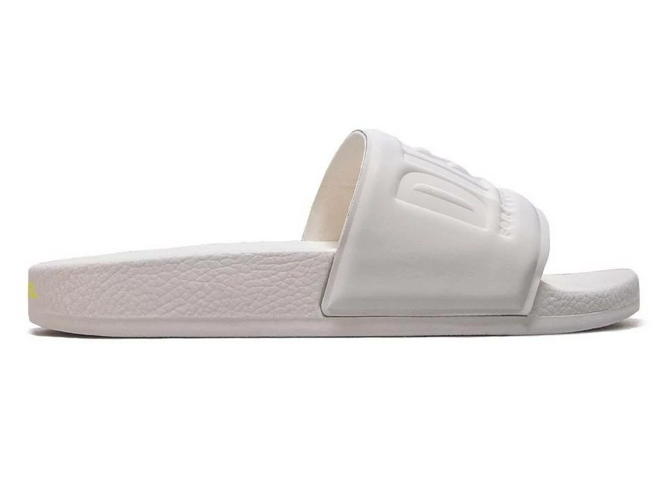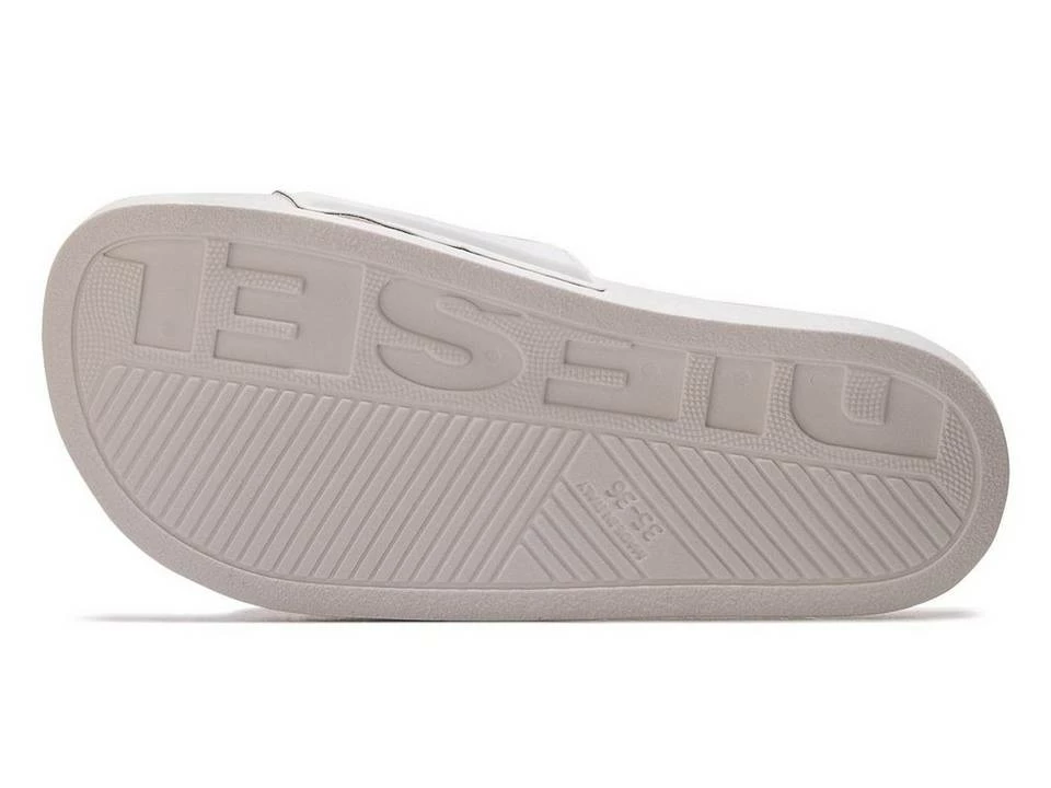 Der Sommer kann kommen! Die ,weiße Damen Pantolette ,von ,Diesel ,kommt in einer angesagten ,Label-Optik. Ein bequemes Fußbett bringt dich bequem zum Einkauf, zum Strand oder begleitet dich einfach durch deine Freizeit zu Hause. Sie werden dich immer stylish auf Trab halten!